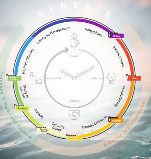 Der Genesis-Prozess gibt darauf eine klare Antwort – und zwar keine, die Flexibilität opfert, um Kontrolle zu gewinnen. Das Herzstück ist die Verbindung aus agilen Arbeitsmethoden und dem Stage-Gate-Prinzip, dargestellt als Uhr: Der Prozess beginnt und endet am Markt – und durchläuft dazwischen zwei klar unterschiedliche Halbkreise. Im ersten, dem agilen, wird die Produktidee iterativ entwickelt und verdichtet. Im zweiten wird strukturiert auf den Launch hingearbeitet.